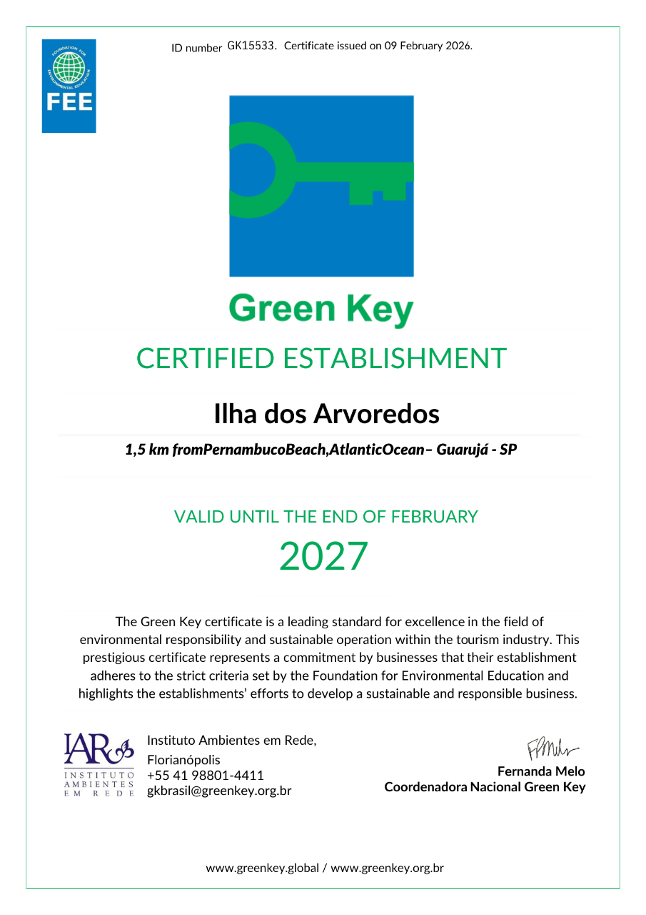 A  Ilha dos Arvoredos, em Guarujá (SP), foi novamente certificada com o selo internacional Green Key, uma das mais importantes chancelas globais de excelência em sustentabilidade no setor do turismo. Com a nova recertificação, válida para 2026, mantém a Ilha como o único atrativo ecoturístico das Américas e do Hemisfério Sul a conquistar essa certificação ambiental dentre os 87 atrativos certificados atualmente no mundo. E integra uma seleta lista de mais de 8.500 empreendimentos turísticos, entre hotéis, atrativos turísticos e outros estabelecimentos em mais de 90 países que possuem a certificação Green Key, consolidando-se ainda mais como referência mundial que promove a Educação Ambiental para a Sustentabilidade.